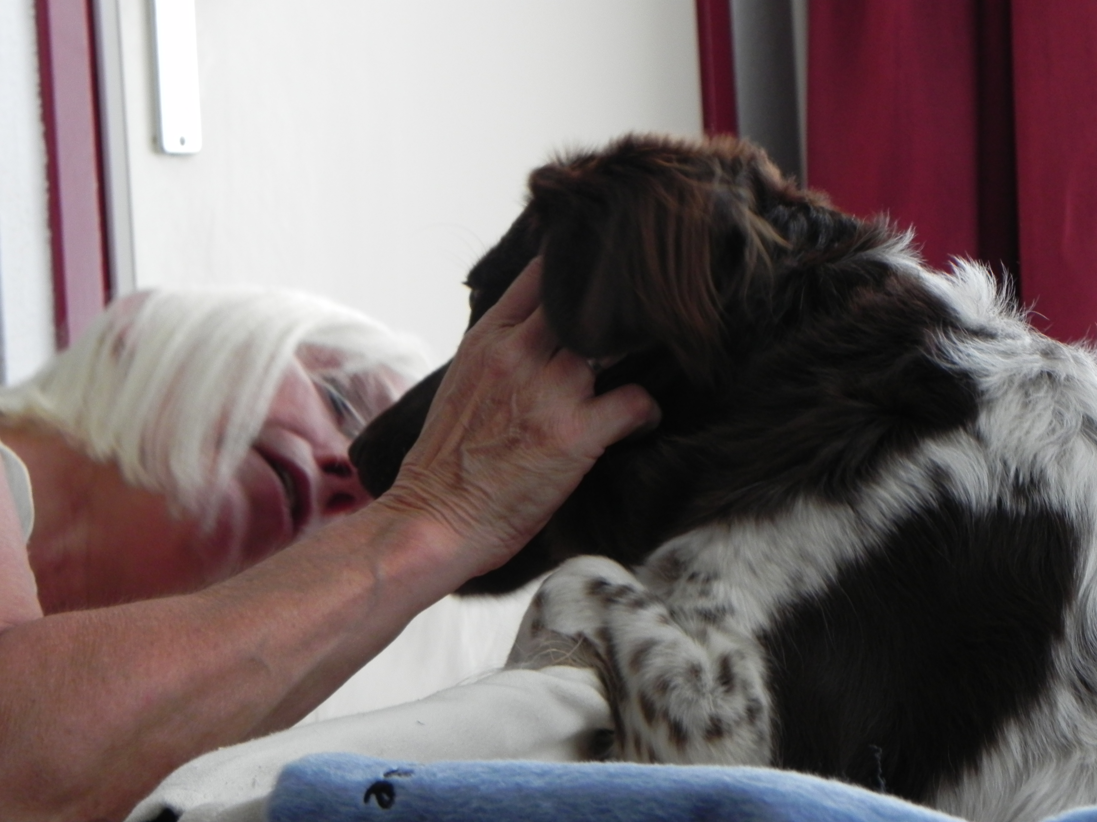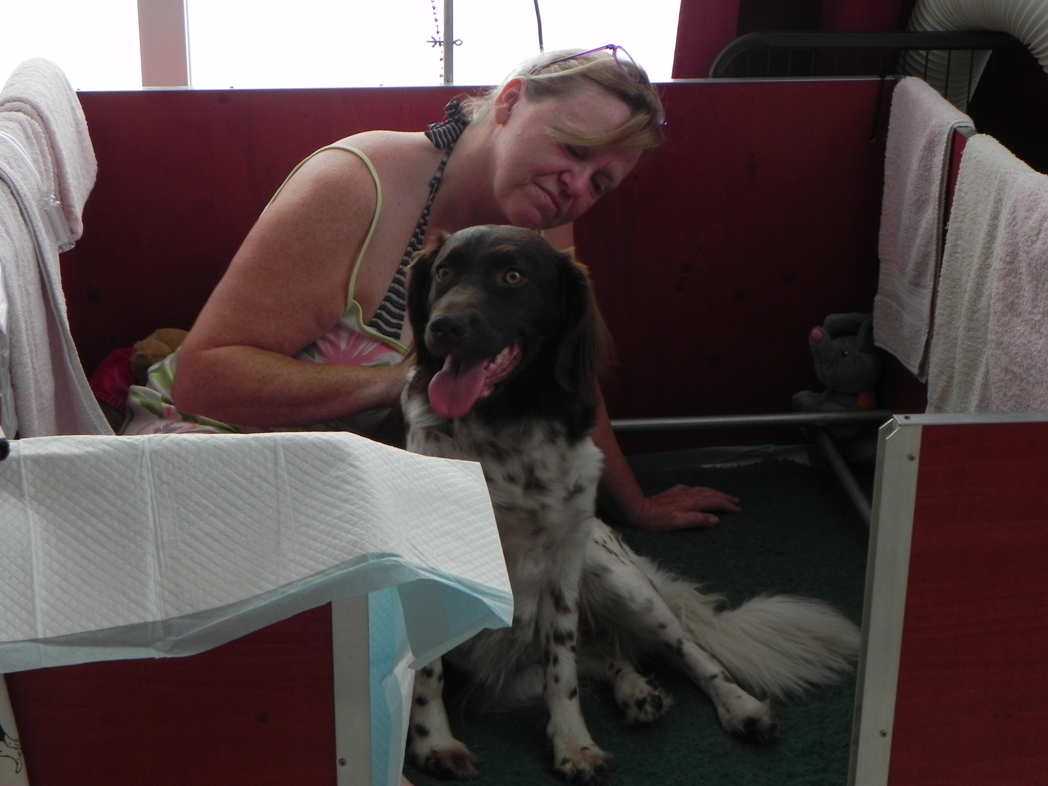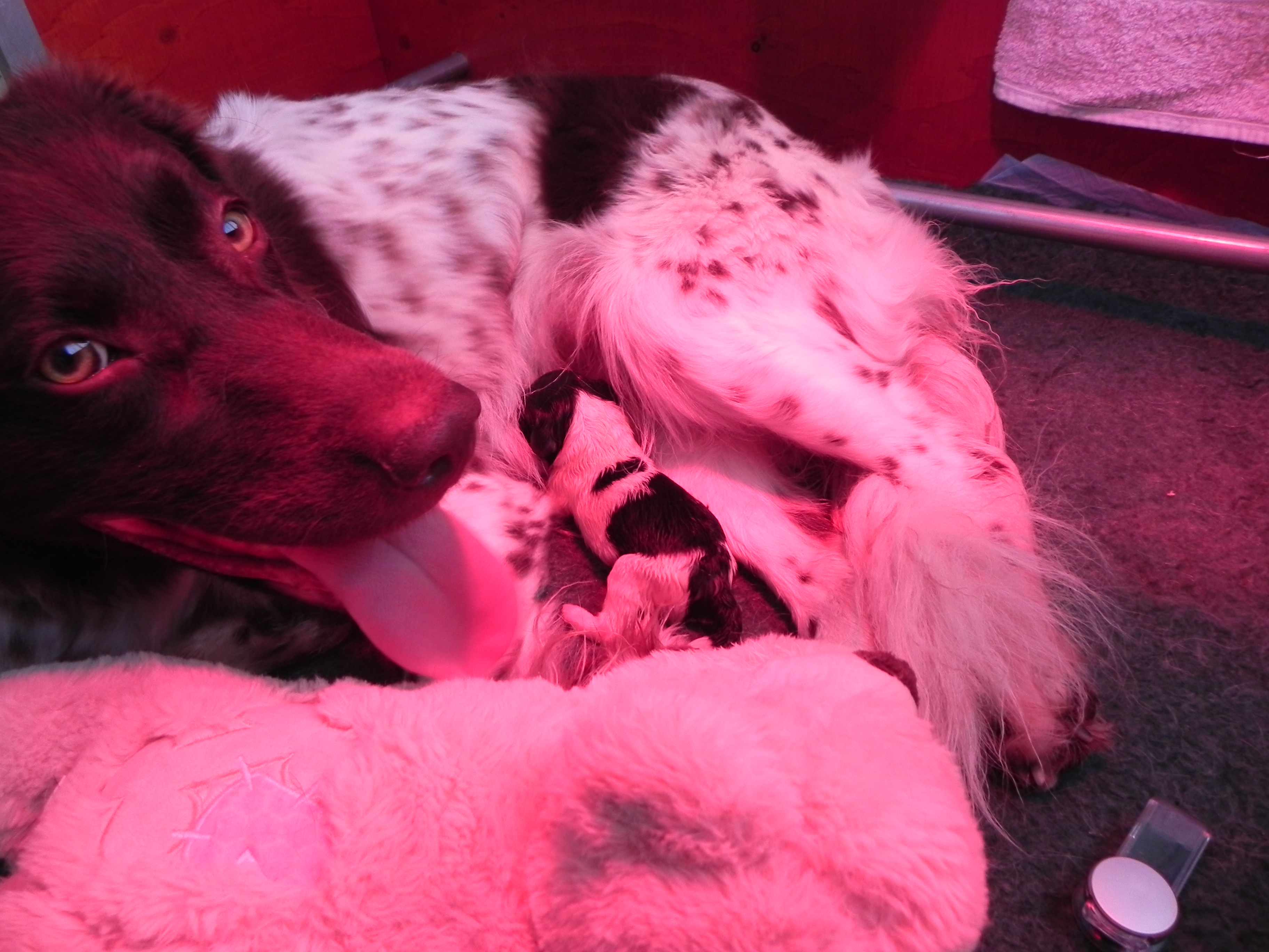 Moet ik echt in die grote mand vrouwtje? Alleen als jij er bij komt zitten!Mag ik eruit Jolande? Ik had zo’n mooi hol gegraven in de tuin!Supersnel na 1 kleine perswee is pup Remi geborenJa Luna; dat is echt jouw puppekindjeDe eerste slokjes