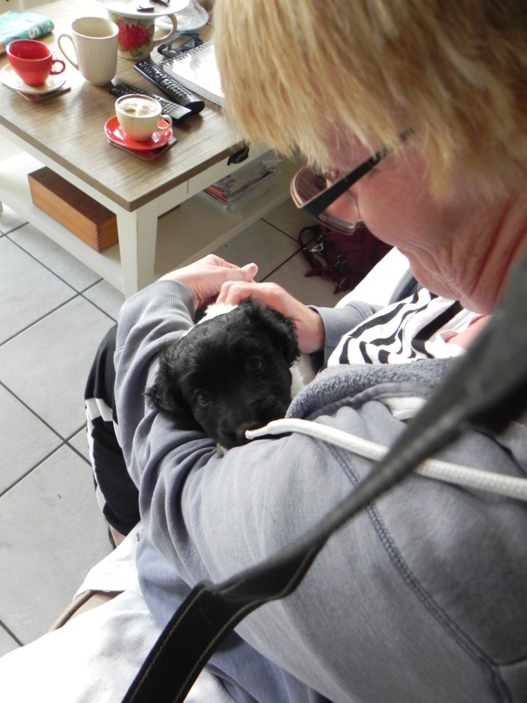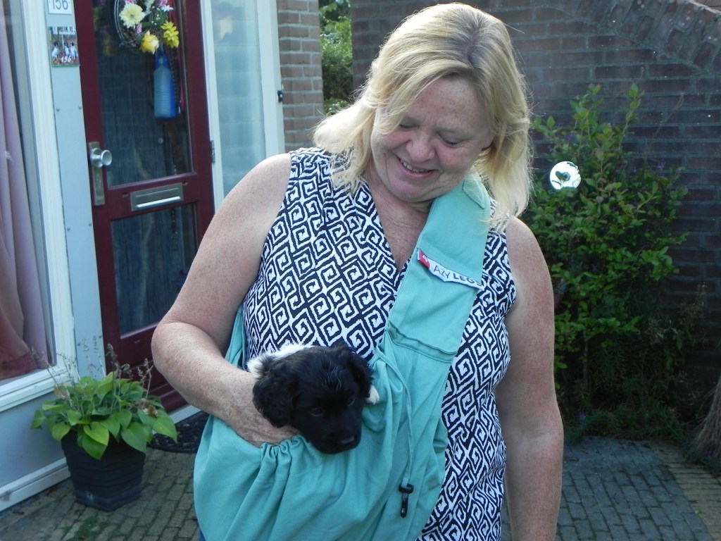 In week 6 veel bezoekers, we voeren van tijd tot tijd in de snuffelmat omdat Remi schrokt. Remi gaat mee in de draagzak. Hij gaat steeds wilder stoeien met Jessie.